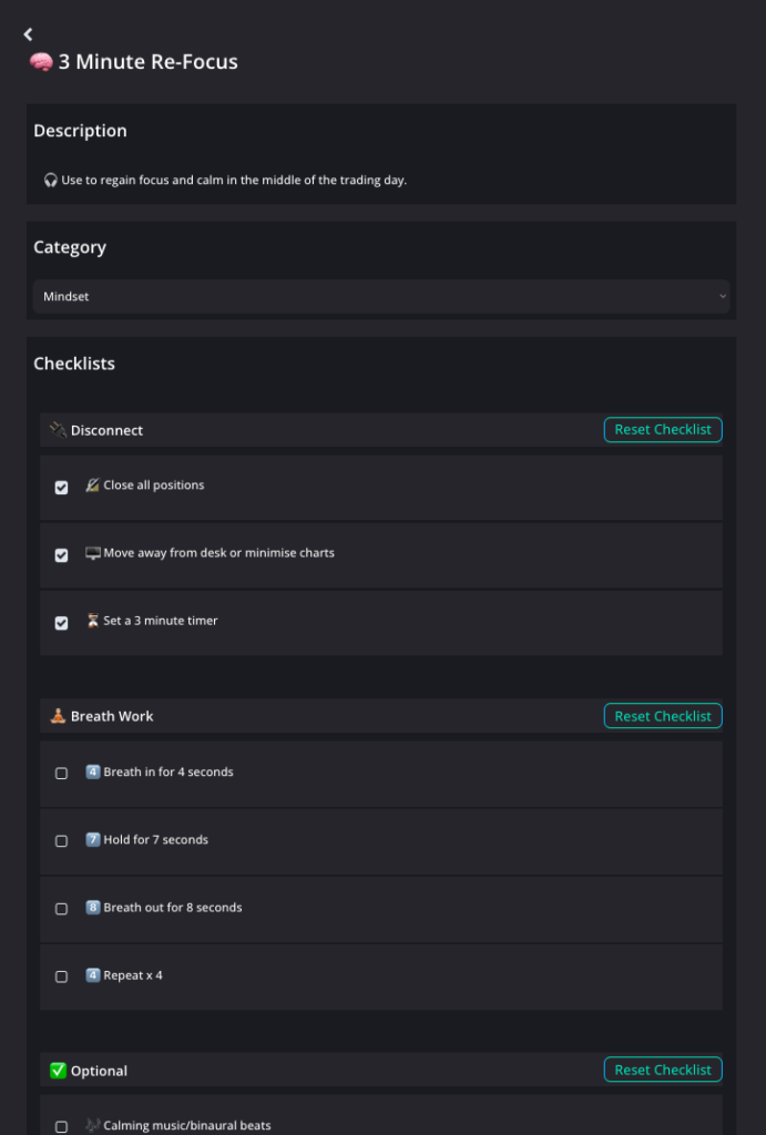 This allows you to track all the metrics that matter: Wins, losses, emotions, and market conditions, which are essential for refining your trading strategies and checklists over time.